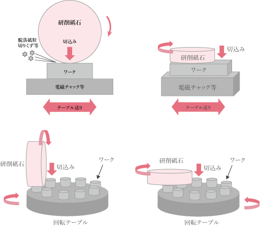 平面研削盤で用いられる研削の仕組みにおいて、タイプごとの特徴をご紹介します。