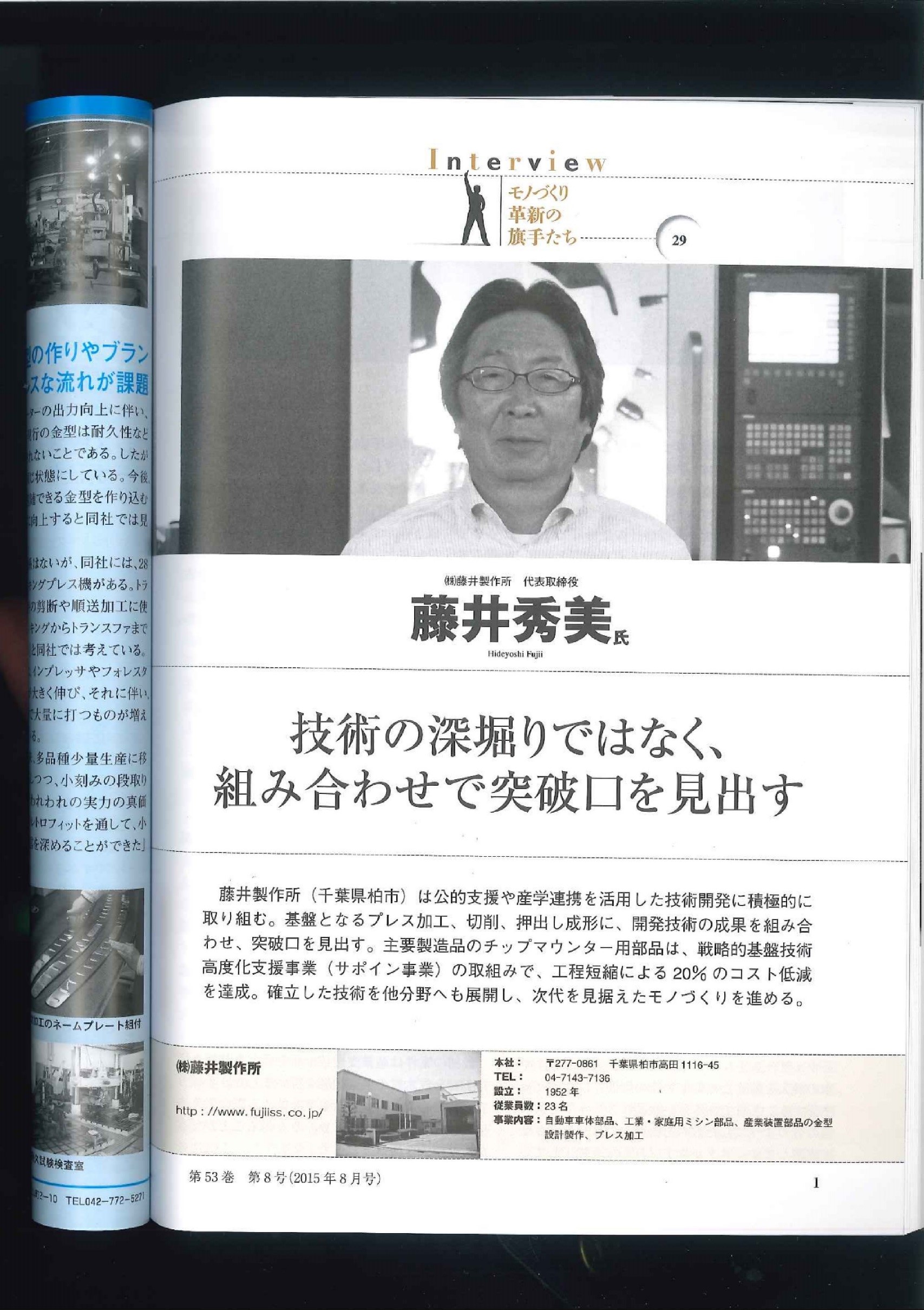 日刊工業新聞社より発行されている塑性加工の総合専門誌「プレス技術」増大号、モノづくり革新の旗手たちの欄にて弊社代表取締役藤井秀美がインタビューを受けた。