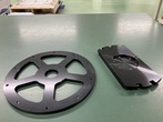 左側の円盤形状の部品は、放射状に肉抜き加工が施され、軽量化と剛性確保の両立が図られています。中心には大径の穴があり、周囲には複数の インチネジ のねじ穴が加工されています。右側の角形プレートも同じくA2017で製作され、中央には円形の段付き加工と複数のタップ穴が設けられ...
